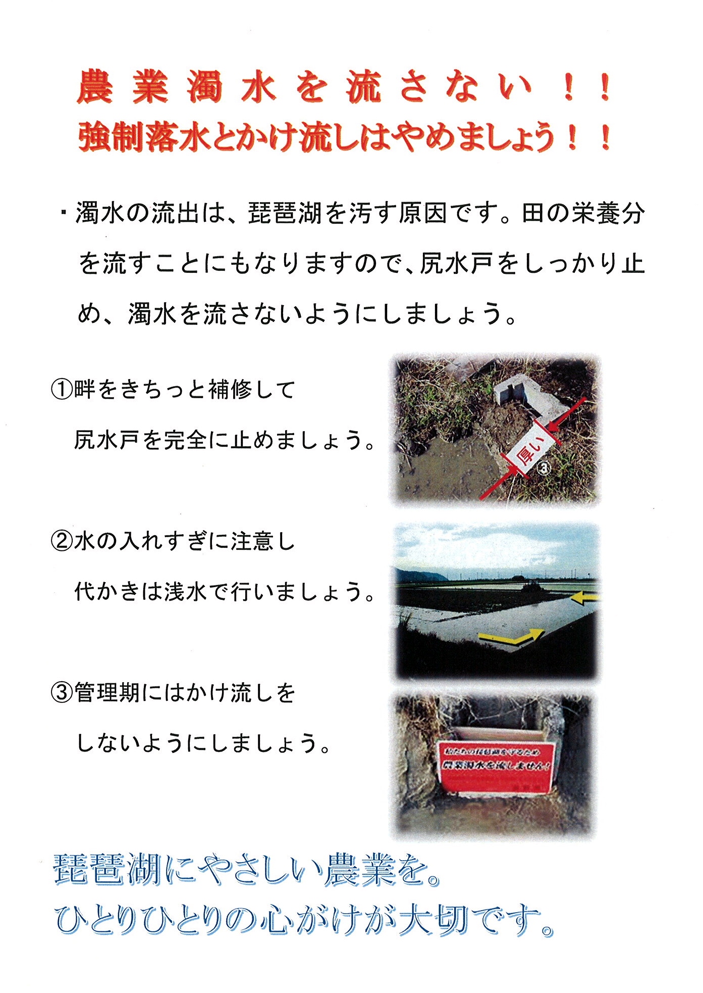 田んぼに水が入れっぱなしになっていませんか?排水路へ水が落ちていませんか?