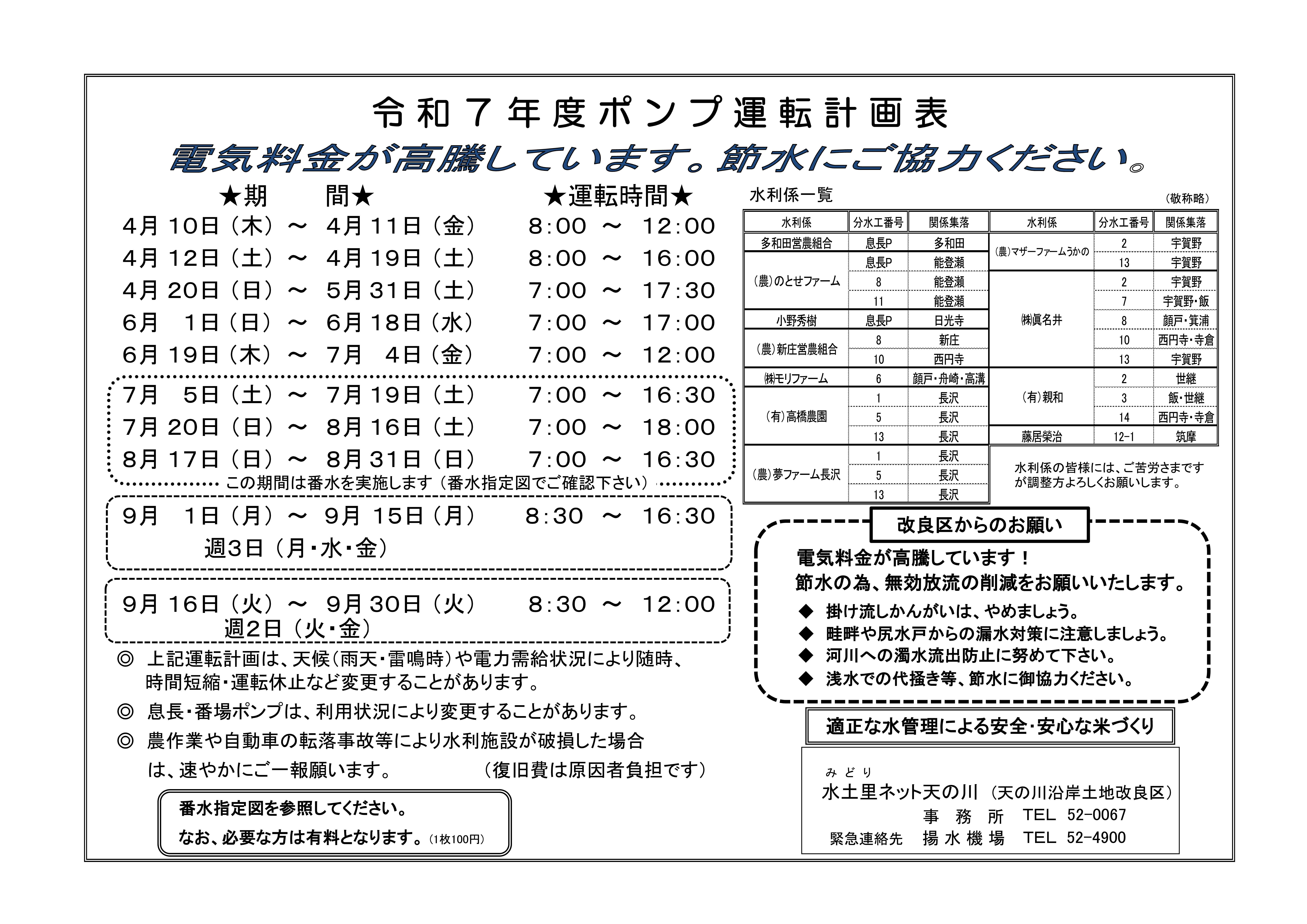 4月10日(木)からポンプの運転が始まります。詳しくは運転計画表をご確認下さい。