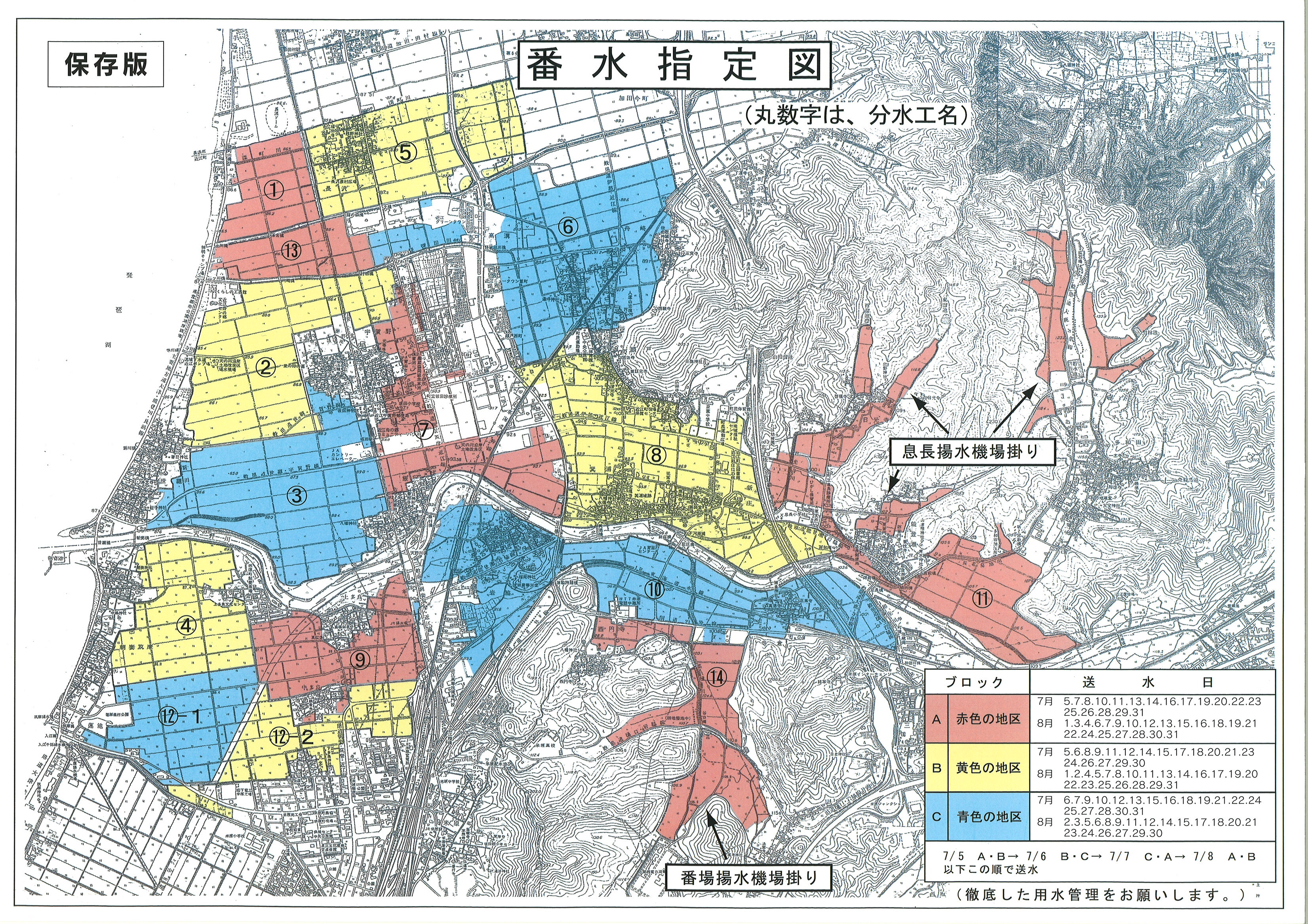 7月5日(土)~8月31日(日)まで番水を実施いたします。送水日については、番水指定図をご確認下さい。