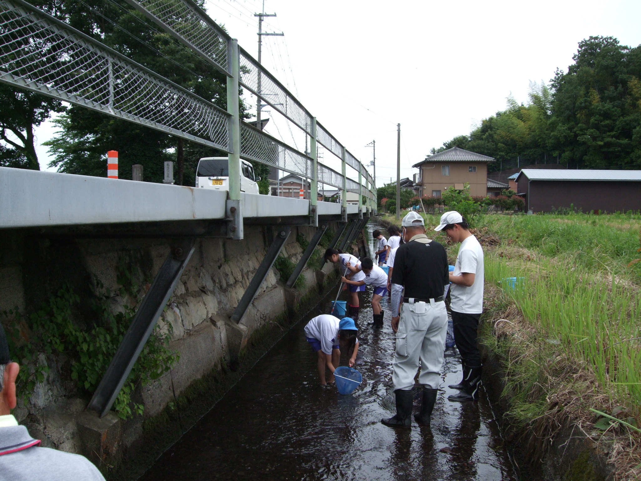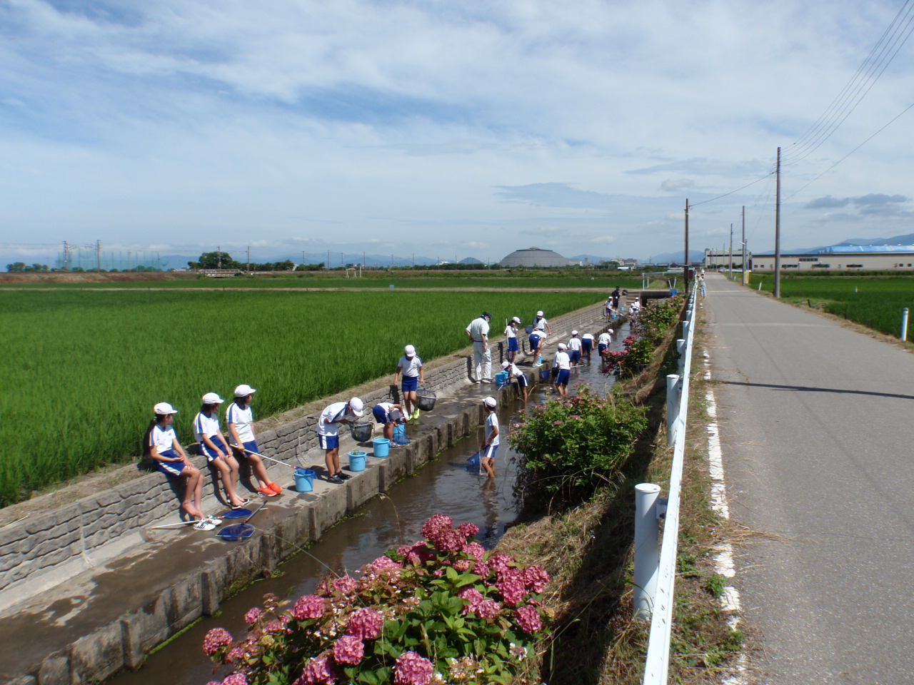 5年生の児童を対象に当改良区が管理する排水路(池の町川)において、水生生物観察会が開催され、改良区も種々サポートさせていただきました。水路に入って生きものを採取し、種類を選別しながら観察しました。田んぼと排水路の役割やそこに住む生物の特徴を学ぶとともに、生物から水質の判定ができることを学んでいただきました。