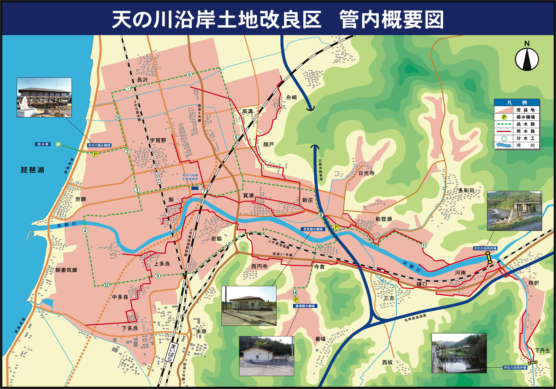 本地区は、古くから湖北地方の穀倉地帯として農業の盛んなところであった。本来、天野川及び丹生川における河川水、地下水を水源としてかんがいされてきたが、琵琶湖総合開発事業に伴う湖水位低下の影響のほか、気運が高まりつつあったほ場整備事業地区の用水系統の見直し、用水量の増大の見込み等により安定した水源が求められた。